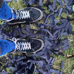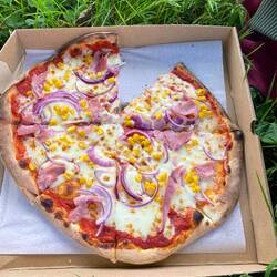 Am Abend machen wir dann erstmal eine schöne Gassi Runde mit den Jungs, auf die uns Liesel natürlich wieder begleitet. Bevor wir dann auf den Weg in Richtung Stadt abbiegen. Nur 10 min Fußweg bis zur Kirche und 15min insgesamt bis zum Pizzabuss ! Das ist für heute unser Ziem. Auch hierher begleitet uns die Königin, allerdings geht sie uns verloren als wir in das erste kleine Wohngebiet abbiegen. Wir kennen das Spiel schon und wissen sie wird sicher dort auf uns warten, setzen also unseren Weg fort. Erstmal geht’s über den Friedhof um die alte Kirche herum, alles ist ein bisschen verwildert aber wunderschön ! Von dort ist es dann noch ein kleines Stück an der viel befahrenen Hauptstraße entlang bis uns zügig schon leckerer Pizzaduft in die Nase steigt. Schnell haben wir uns jeder für eine Sorte entschieden. 15min später ruft hören wir schon „your Pizza is ready Ladys“ der Pizzabuss wir von einer Crew aus drei Frauen geführt und als wir im Park an der Kirche auf der Wiese sitzen und essen kommen wir aus dem schwärmen nicht mehr raus, so lecker ist die Pizza!