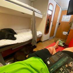 Für eine Fähre stehen die Autos dann relativ weit auseinander so das gut Platz ist um mit den Hunden raus zu kommen. Liesel machen wir die kleine Klimaanlage an und lassen sie im Bis. Sie schläft jetzt eh also wäre es nur Stress sie mit nach oben zu nehmen. A propos Stress. Auf so einem Schiffchen ist ja immer alles sehr eng. So auch hier. Wie alle wissen, ist das nicht so spencers Ding, eng mit vielen Fremden Mensche. Baloo als Profi und ich als seine Begleitung gehen also vor und strahlen so viel Souveränität wie möglich aus, obwohl wir selbst nicht genau wissen wohin. Es klappt erstmal ganz gut, Spencer grummelt zur Sicherheit alle an die ihm zu nahe kommen aber grummeln ist ja nicht verboten. Im Fahrstuhl schnauft er dann durch und ist nur kurz von seinem Spiegelbild irritiert. Der Weg zur Kajüte ist Gott sei dank nicht lang und als wir ankommen müssen wir schmunzeln. Eine Tierfreundliche Buchte haben wir gebucht. Es kam schon vorher die Frage auf, was das wohl bedeutet. Es ist ein wenig mehr Platz, der Boden ist kein Teppich sondern abwaschbarer PVC Belag in Holzoptik und es gibt ein kleines rotes Ledersofa was wohl für die Hunde gedacht ist. Offiziell sind hier übrigens entweder 2 mittelgroße Hund bis 30 Kilo oder 1 großer Hund über 30 Kilo in der Kabine erlaubt. Wenn also jemand fragt Baloo wiegt 20kg und Spencer 30. sind doch beide schlank 😉