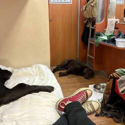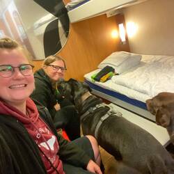 Ca 90 min vor Ankunft kommt eine durchsagen das man in einer halben Stunde je Kajüte verlassen muss. Das irritiert uns ein wenig, weil das heißen würde das wir 1 Stunde mit den Hunden irgendwo Tod schlagen müssen wo wir eigentlich mit ihnen nicht hin dürfen. An der Information können sie uns aber beruhigen. Die Tiere dürfen mit ihren Besitzern bis zur Ankunft im Hafen in der Kajüte bleiben. Für uns wird es nochmal eine extra Durchsage geben. Genauso passiert es auch. Wir suchen eine Weg möglichst zügig durch die Menschenmassen. Wieder gehen Baloo und ich vor und als wir beide vor den Fahrstühlen etwas verwirrt stehen bleiben in einer langen Schlange sieht ein Crewmitgleid meinen suchenden Blick und zeigt den Weg Richtung Treppenhaus. Das haben wir gesucht! Ein überfüllter Fahrstuhl kommt nämlich mit Spenci ganz und gar nicht in Frage das wäre Stress pur. Das Treppenhaus ist dann eine Herausforderung der etwas anderen Art. Die Treppen sind unheimlich steil und Tiefe ist etwas wovor Baloo einen heiden Respekt hat. Er legt sich erstmal flach auf den Boden. Kurz überlege ich ihn zu tragen, bin aber nicht sicher das mit ihm aufm Arm Stolperfrei zu schaffen. Also motiviere ich ihn überschwänglich und gehe ein Stück vor. Das gibt ihm einen Ruck und er überwindet sich. So weit am Rand wie nur möglich läuft er so schnell er kann die Treppen und tritt sogar einmal ein den Spalt zwischen Treppe und Wand. Ich helfe ihm schnell wir atmen kurz durch, es gibt ein motivationskeks und dann schaffen wir das letzte Stück. Fix und fertig kommen wir am Bus an und Baloo legt sich sichtlich erleichtert auf seinen Platz.