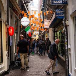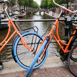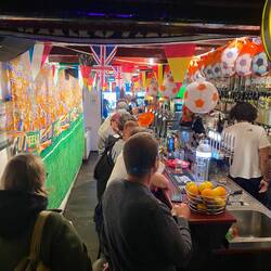 Als dann alle Wäsche sauber und trocken ist sind die Jungs längst eingeschlafen, die Königen übrigens schon den ganzen Tag denn es ist ihr zu nass draußen. Sie Wolken lichten sich ein wenig und wir streunern los in Richtung City. In der Metro ist schon klar, heute ist ein besonderer Tag für die Hollies. Die Farbe Orange überwiegt ganz klar und alle sind in freudiger Erwartung auf das EM Achtelfinale. Man ist wirklich versucht sich auch ein orangenes Kleidungsstück in einem der vielen Shops zu zu legen doch wir können uns gerade so noch beherrschen. Die Straßen sind deutlich leerer als sonst und an einigen Geschäften ist der Hinweis zu lesen, dass ab 17.30uhr wegen dem Fußballspiel geschlossen ist. Da wir gar kein bestimmtes Ziel haben bummeln wir erst noch ein wenig. Laufen noch zwei drei kleine Souvenirs und gehen 18 Uhr finden wir uns auf meinen Wunsch hin in einer Bar wider. Alles ist in orange geschmückt und auch andere europäische Landeswimpel hängen an den Decken. In jedem Raum gibt es große Fernseher wo das Spiel zu sehen ist. An der hoffnungslos überfüllten Bar bestellen wir uns ein Bier und eine Cola. Es gibt mehrere Etagen die aber schon vollgestopft sind. Also setzten wir uns in den Außenbereich von wo aus der Fernseher auch gut zu sehen ist. Kaum sind wir dort angekommen erfüllt lautes Gejubel und Geklatsche die ganze Straße! Fröhlich feiern die Hollies das 1. Tor. Die Stimmung ist fantastisch und wir genießen einfach den besonderen Moment. Nach der 1. Halbzeit erlöse ich Susi und wir spazieren weiter durch die kleinen, engen Gassen die wir so lieben und die heute so herrlich leer sind. Nur vor jeder Bar mit Fernsehen tummeln sich Oranje Fans. Susis Ziel it ein Thai. Sie möchte unbedingt Sticky Rice mit Mange eine thailändische Nachtisch Spezialität und wirklich lecker !