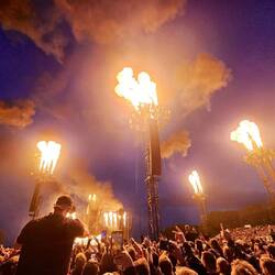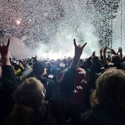 Pünktlich nach der Vorband ist das Spiel vorbei und die Massen strömen ins Infield. Wahnsinnig voll ist es, wir sehen quasi nichts direkt von der Bühne, aber immerhin Feuershow und Sound sind super! Wir genießen den Abend sehr, schaffen es nur leider nicht unsere lieblingsdänen noch kurz zu drücken. Denn sie haben Karten in der Feuerzone und zwischen den Massen finden wir sie nach der Show nicht.