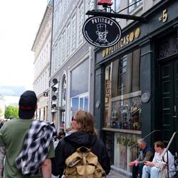 Gegen Mittag spazieren wir los. Die Sonne scheint wir haben 21 Grad und die Stadt ist hellwach. Paddy navigiert uns ganz langsam Richtung Christiania. Aber nicht auf direktem Weg, welcher an der großen viel befahrenen Hauptstraße lang führen würde. Wir biegen lieber in kleine Gassen ein. In einer Fußgänger Zone finden wir einen kleinen aber feinen Sandwich laden, der auch leckeren Kaffee anbietet. Das späte Frühstück schmeckt hervorragend und gibt Energie für die Fußmarsch. Die Straßen sind sauber. Bunter Häuser in altem Stil begleiten uns. Immer wieder unterbrochen von kleinen oder größeren Kirchen. Viele Vintage Läden ziehen uns in ihren Bann. Auch ein schöner Plattenladen ist dabei in den Paddy und ich wie von Zauberhand hinein gezogen werden. Susi findet einen Straßenstand mit frisch gebrannten Mandeln und muffelt glücklich vor sich hin. Einer größere, ältere Brücke die hübsch verziert ist führt uns auf die andere Seite des Wassers. Hier gibt es viele kleine Wasserarme die durch die Stadt führen. Kleine bunte Boote schippern umher und auf den kleineren Ausläufern gibt es sogar schwimmende Gastronomie. Wir jagen Zimtschnecken für später und nach etwas 2 Stunden kommen wir dann in Christiania an. Ein Freistaat mitten in Kopenhagen. Dazu gibt es eine interessante Geschichte die detailliert auf Wikipedia nach zu lesen ist und hier keine Buchstaben verbrauchen soll 😉