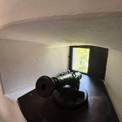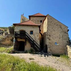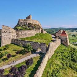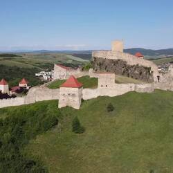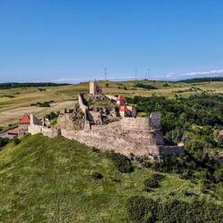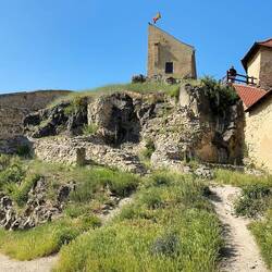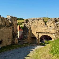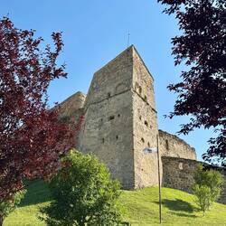 Schon von der Zitadelle haben wir laute Musik 🎶 gehört. Ein Dorffest und einige Straßen sind gesperrt. Google schickt uns kreuz und quer durch den Ort und wir müssen eine abenteuerliche Brücke mit Holzbelag überqueren. Aber zum Glück steht vorher ein Schild bis 5 t zugelassen! Es knarrt und knirscht, aber es hält ☺️. Dann noch einmal ein Blick auf die Burgruine. 😍もっと詳しく