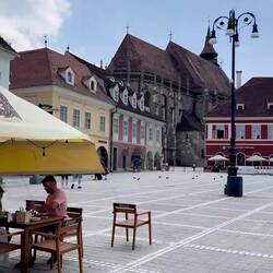Wir haben einen kleinen privaten Stellplatz in der Stadtmitte von Braşov (Kronstadt) aufgesucht. Mittels abenteuerlicher Schlauchverlängerung haben wir auch Wasser auffüllen können. Man kann nicht genug Wasseradapter auf solche Touren mitnehmen! Tagsüber suchen wir die sehr schöne Stadt auf. Es geht steil bergauf und wieder herunter wenn man die Stadt von hier zu Fuß erkunden will. Die Hitze tut ein übriges und so nehmen wir zurück ein Taxi 🚕 ( 30 Lei sind echt günstig und so geben wir 10 Lei Tip)