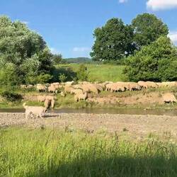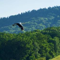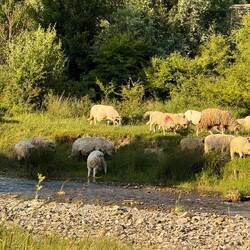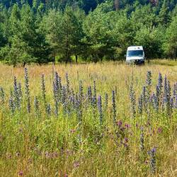 Nach längerer Fahrt durch die schönen Ostkarpaten schlagen wir unser Nachtlager an einem kleinen Fluß auf. Die Füße werden im klaren Wasser abgekühlt. Ein Storchenpaar hält sich in der Nähe auf.