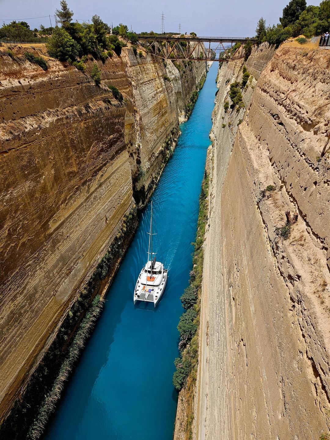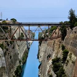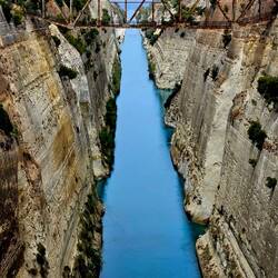 Le canal de Corinthe est une voie d'eau artificielle creusée à travers l'isthme de Corinthe. Liaison de 6.5 km entre la mer Egée et la mer Ionienne.