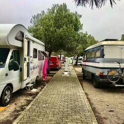 We found a spot in the camping car area and it was full of vanlifers and surfers so we parked at the end furthest from the toilets, hooked up and then waited for the rain to stop while we had a cup of tea.
