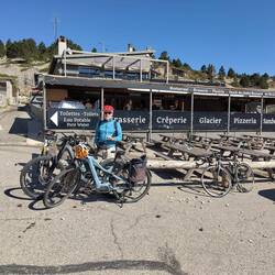 Bei schönem Wetter mit den Velos auf den Mont Ventoux! Dieses Mal haben wir es geschafft -jetzt haben wir 24km Abfahrt vor uns 😄
