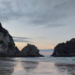 Nachdem das Zelt aufgebaut war, machten wir im Schutz der untergehenden Sonne einen Nachtspaziergang und entdeckten die unendliche Vielfalt an Felsen, Höhlen und Formen, die dieser Strand zu bieten hat. Wie zwei Kinder entdeckten wir jeden Winkel, suchten nach Krabben, durchquerten kleine Höhlen und bewunderten die Farbe des Wassers und den Himmel zwischen den rosa Wolken.