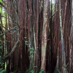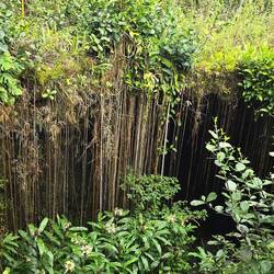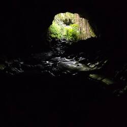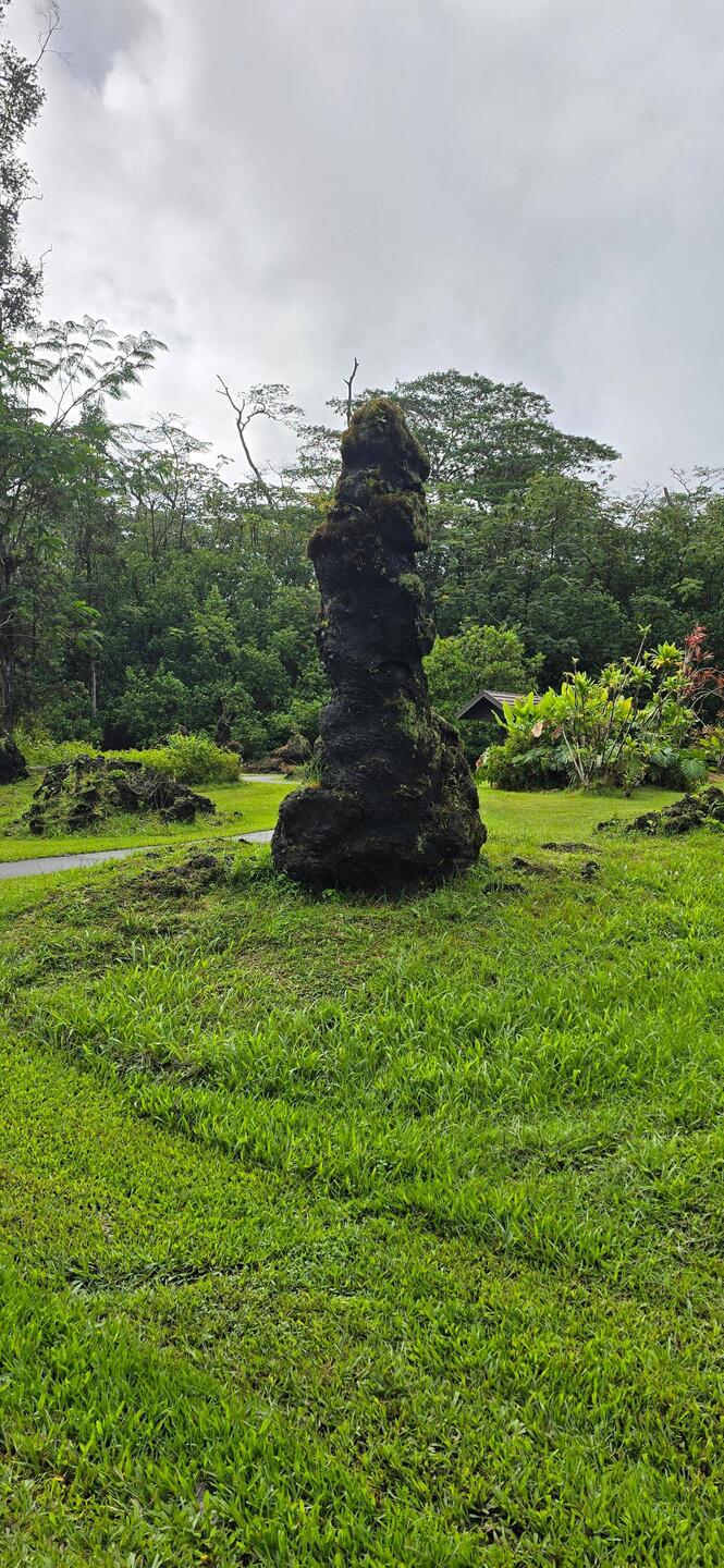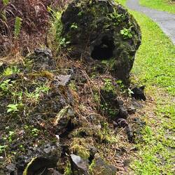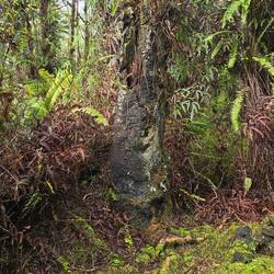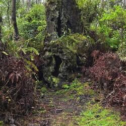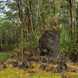 Ein Lavastrom hat ein Wäldchen umschlossen. Beim Kontakt mit den Baumstämmen erstarrte die Lava und sie wurde zu einer festen Kruste.
