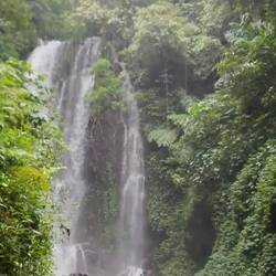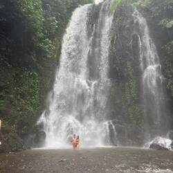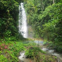On s'enfonce dans cette végétation, personne à l'horizon, il n'y a que nous et le petit chemin de terre. Après de longues hésitations sur la direction à prendre, on finit par atteindre notre premier objectif : une magnifique cascade. Elle est immense et de nombreux arc-en-ciel l'entourent. On est bluffé par le débit d'eau qui coule en continue et la beauté du spectacle !