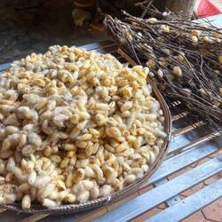Enfin le poivre blanc : c’est le plus rare car en fait le poivre blanc est le noyau du poivre rouge. Comme je le disait avant on a mangé la peau du poivre rouge car au centre il y a un petit grain blanc. Ça c’est le poivre et pour le récupérer le processus est différent. En partant des grains de poivre rouge, ceux-ci cuisent beaucoup plus longtemps dans l’eau bouillante car il faut que leur peau se détache. Enfin le même processus de séchage a lieu.