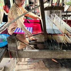 Ensuite direction l’île de la soie. Sur la route on a eu à faire à notre première arnaque. On attendant au feu et on dépassait un peu d’une ligne blanche mais tout le monde fait ça ici. Après le feu des policiers nous arrêtent et on nous emmène vers le chef dans une sorte de tente. Il nous dit qu’on a dépassé la ligne et il a une photo de nous où c’est le cas. C’est 25$ d’amende par scooter. On donne 30 et on s’en sort mais il nous a clairement dit de mettre l’argent dans un petit cahier et ne nous a pas rédigé l’amende ni rien. Autant vous dire que tout allait aller dans sa poche. Il nous a aussi empêché de traduire ce qui était marqué sur sa feuille au niveau des prix des amendes comme si on n’avait pas le droit de savoir ce qu’il nous demandait. Enfin bon on s’en sort pour 10$ chacun ça va encore. En plus en partant on a vu clairement une voiture passer autour du policier qui essayait de l’arrêter et partir très vite en délit de fuite 😂. Après une petite heure de route on arrive au ferry qui part directement la chance. On plus ça coûte moins d’un euro à 3 avec nos scooters sur le ferry. On arrive sur un première île où on trouve enfin un restaurant ouvert puis on se dirige vers l’île de la soie. Dans celle-ci on s’arrête visiter une usine de tissage enfin c’est pas les usines comme chez nous! C’est dehors, il y a une dizaine de métier à tisser et des femmes qui travaillent la soie. Le fonctionnement des machines est totalement manuel en appuyant avec les pieds sur des pédales, cela permet aux fils de s’entremêler et de tisser petit à petit avec différents motifs selon les machines. On regardera ensuite le couché du soleil depuis l’île puis reprenons notre ferry.