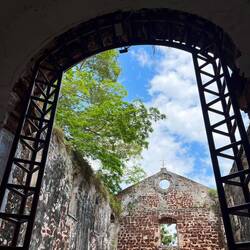 Me voilà ensuite parti pour la Melaka straits mosquée. J’ai une bonne petite marche pour l’atteindre mais je n’avais pas envie de reprendre le taxi. C’est une mosquée juste au bord du détroit de Malacca presque dans l’eau. Elle est immense mais je n’ai pas pu rentrer entièrement dedans n’étant pas musulman. En rêvant de celle-ci je décide d’aller manger dans le centre, plus précisément la Jonker street réputée pour son marché et ses multiples restaurants. En cherchant où manger je passe devant plusieurs statues d’un monsieur musclé, toujours le même. En fait un habitant de malacca à été Mr. univers dans le temps et il semblerait que ce soit une figure emblématique de la ville. Je m’arrête au « Trois by navy » ou je mangerai un Rice bowl au saumon et au crabe et pour le dessert un coconut affogato, spécialité de ce restaurant, un café avec deux boules de glaces à la noix de coco. C’était super bon. Après ce bon repas je me dirige pour voir un des derniers monuments que je n’ai pas encore vu, la Porta De Santiago, qui mène à la forteresse portugaise construite en 1511.