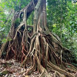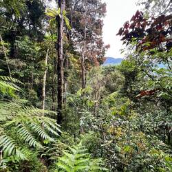 Là petite erreur je n’avais pas vu qu’on pouvait rejoindre le chemin de la montagne depuis la Canopée alors j’ai fait tout le chemin inverse mais ce n’est pas bien grave. Au final je continue de croiser du monde même dans la montée, beaucoup de touristes y allaient où redescendaient. Je me mis alors « sur la file de gauche » pour passer la seconde et arriver en haut plus rapidement. L’ascension est plutôt courte ca resemble à notre Bastille Grenobloise, 350m de dénivelé positif et 2km de montée. Lors de celle-ci le chemin sur plate-forme s’arrête et on navigue entre les arbres les fourmilières et les racines. La vue en haut offre un beau panorama sur les montagnes lointaines que l’on peut atteindre en trek sur plusieurs jours. Je prends alors la direction du prochain poste d’observation.