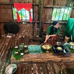 Maison Bajau (deuxième plus grand peuple à Sabah) : ici c’était surtout dégustation, d’abord de jus de pandan puis de pancake au pandan et enfin une sorte de pâte à base de farine de riz qui plongée dans l’huile bouillante faisait des fils croquants. Tout était assez sucré mais plutôt bon ! On a vu l’hôtel où se tenait les mariés à l’époque, une sorte de grand banc avec plein de tissus de toutes les couleurs.