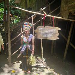 Maison Dunsun du Vin de riz : cette maison est une maison en bois, comme toute celle qu’on verra. Le toit est fait avec des feuilles de palmier. Le bois utilisé est un bois de l’île de Bornéo appelé « Iron Wood » pour eux car il est solide comme l’acier. Dans toutes les maisons, les femmes et les enfants ont des chambres mais les hommes dorment dans la pièce principale pour être prêt à se battre s’il y a une attaque. Les traditions anciennes des villages sont assez sombres mais on en apprend plus dans les maisons suivantes. Dans celle là on a vu que la fille dormait dans un lit en hauteur dont l’échelle était retirée la nuit pour le pas qu’elle parte faire le mur. On a pu observé deux façons différentes de faire du vin de riz. La première est en faisant fermenter du sucre de l’eau du riz et un peu de tabac avec de la levure de riz fabriquée au préalable. La deuxième est avec une sorte d’ancien alambique. Le premier vin était très goûtu et plutôt bon aux alentours de 12-14 degrés. Le deuxième était plus comme de la vodka mais à 15-20 degré, de l’alcool d’eau un peu. Ça faisait quand même bizarre de boire des shots a 9 h du matin mais bon. Dans cette maison ils ont un feu dans leur cuisine. Le feu chauffe sur différents étages pour conserver la nourriture. Le reste est stocké dans des grosses jarres. On a pu ensuite goûter un met local, une sorte de préparation de boulette de viande de poulet à l’oignon qu’on remplie dans un bambou et qu’on met au dessus du feu ensuite. C’était vraiment pas mal !