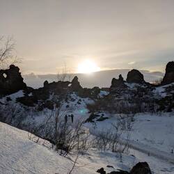Wir befinden uns hier in einem Vulcan Feld und man kann auf verschiedenen Wegen die Felsformationen, Höhlen und Vegetation bewundern. Da es Winter ist und die Wanderung durch tiefen Schnee etwasMeer informatie