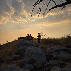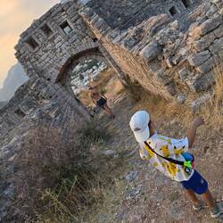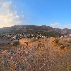 A parti sétány végén egy kis ösvény indult fel a vörös sziklák között, ami még vörösebbnek tünt a fények miatt, ugyanis pont naplemente előtt kezdtünk el felkapaszkodni. Az első kilátópontról aztán elénk tárult a környék teljes panorámája, amit még akkor is lélegzetellálítónak éreztünk volna ha nincs épp 36 fok és van is levegőnk, de így meg halmozottan az volt. Gyors vízpótlás és kapaszkodunk tovább az erőd maradványok felé kiszáradt, és pár éve láthatóan szenessé égett tájon, kis kavicsos ösvényen. Mígnem aztán a lemenő nap vörös hátterével elénk nem tárult az erőd, amiről azóta már azt is tudom, hogy ez a Tabija erőd maradványa, amit a törökök építettek még 1860 körül határvédelmi céllal, mert innen nagyon jól belátható az egész környék, majd az Osztrák-Magyar Monarchia szerezte meg az 1800-s évek vége felé, és szintén egy erődrendszer részeként használták. Viszont az utóbbi időben eléggé el van hanyagolva, de legalább gyönyörű helyen van és irtó hangulatos.