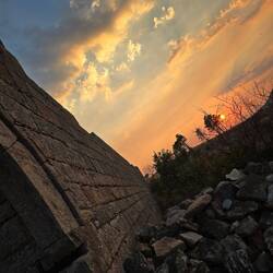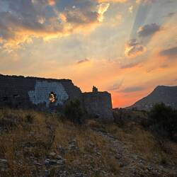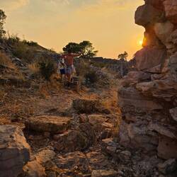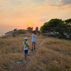 A város felől közelítve ez egyik ablak alatt a falon hatalmas kék nyíl, és alatta felhalmozott kövek, gondoltuk ez lesz a bejárat. Át is másztunk rajta, majd később rájöttünk hogy van egy hatalmas, boltíves kapu is 100 méterrel arrébb, de hát az ajtón bárki be tud menni, az én gyerekeim a kihivásokat és a kalandokat keresik 😁😁. Belül amúgy csak falmaradványok voltak, de a kilátás mindenhonnan gyönyörű, illetve volt 3-4 kör alakú beton teknő, ami vagy rakéta állás lehetett vagy szocialista minimál stílusú betonjakuzzi, de mindenesetre érdekesen nézett ki. Kicsit kiültünk a fal szélére, néztük a tengert, meg a naplementét, aztán mikor kezdett gyűlni a tömeg (úgy látszik tűző napon mások se akartak sziklátmászni), elindultunk lefelé.