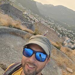 De előtte még kéne egy kis reggeli is, szóval előbb lementem a házunk alatti utcában lévő kis pékségbe, de ez inkább fornettis mint pékség szóval jöhet a B verzió, ami felettünk 500 méterre a dombtetőn van, a főút túloldalán. Hangulatosan lerobban kis utcákon át felmentem a dombra, elhagytam egy félbehagyott hotelt tele hasznos építési alapanyagokkal, majd egy apartman mögött a susnyáson át egy kis ösvényen fel a főúthoz. Az átkelést valószínűleg egyik biztosító sem vállalná be a balesetbiztosításban, de sikerült átérnem 2 hullám közt, és irány a Pekara Montenegro. Hatalmas minden péksüti, veszek perecet, valami kerek szezámmagos bigyót, pisztáciás croissant és "egy" kifla-t (ami 8 kifli összesütve egy nagy kerek cuccként, de le lehet tépkedni kiflinként, 1,2 EUR-ért 😁😁) Kb 3 napra elég szénhidrát 😁😁