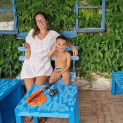 Otthon már várt a család, hogy akkor búcsústrandolás indul. Mivel ma már nincs kenuzás, egy csomaggal kevesebb, majdhogynem szökkengetve vittük le a "csak" 30 kilónyi cuccot (tuti kell egy húzóskocsi), és lepakoltunk az aleppafenyőligetbe az árnyékba. Kis napozás, aztán gumirepcsivel, gumimatraccal, és két gumimacival (mert egész nap pattognak) irány a bója. Kis pihenés, mert Brúnó ideágig próbált SUP-ot csinálni a matracból, ami után folyton úszni kellett hogy elkapjuk (a matracot persze, Bubu profin úszik) aztán visszafele Arti is lepattant a repcsiről és mentőmellényben evickélt meg búvárkodott a partig. Kis pihenés, szendvicsebéd, nektarin, olvasgatás, és kezdtük az egészet előlről.
