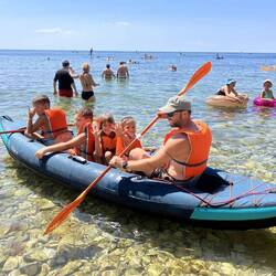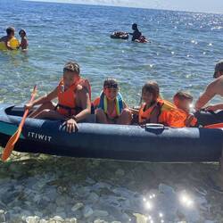 Kenuzás után egy kis úszás ahol megmutatjuk meddig kenuztunk be, majd vissza a kenuba hogy Zsu és Arti is átélje az élményt, aztán ismét irány a part, mert Apának kéne azért pár perc pihenő... kaptam 8-at, mielőtt újra búvárkodás, aztán egy kis pancsolás, majd gumimatrac tologatás és már vége is az erőmnek, és még a tejsavképződésem is érezhetően beindult a nagy munkában. Még szerencse hogy a Kovács gyerekek nem nyalogattak végig, mert mindhárom tejérzékeny, nem is akarok belegondolni a vállamtól hágy napig lettek volna tüneteik.