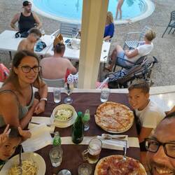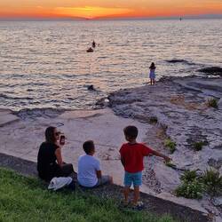 Miután körbefotóztunk mindent, meglett az összes naplementésromantikusmemoár, elindultunk éttermet keresni. Hatalmas ez a komplexum, szóval volt vagy 20 perc séta megint mire rátaláltunk a kajasorra, balra marinara ami halas szóval a jobb oldali jó lesz. Pizza, pasta, sali, mint ha Olaszországban lennénk (mondjuk közel is van, sőt mielőtt Jugoszláviához csatolták Isztriát a lakosok 80%-a olasz volt a szigeten, aztán gyorsan visszaesett 0 közelébe, de a kajakultúra maradt). Mire végeztünk a vacsival meg a fiúk 1-1 óriásjégkrémmel, már korom sötét lett, de elég hamar visszataláltunk a kocsihoz. Otthon 2 felé váltunk, Zsuzsi altat, én kipakolom a konyhát meg összeszedem a strandcuccokat . Ezt a munkamegosztást utána is tartottuk, míg Zsuzsi befejezi a ruhapakolást meg szendvicset gyárt, én iszom a fröccsöm a teraszon, blogot írok és hallgatom a szomszédban zajló féktelen házibulit, ahol bár a zene időnként még jó is, de sajnos a karaoke mikrofont lenyúlta egy Brunó forma (hang alapján, mert nem látom) gyerek, aki úgy érzi minden számban énekelnie kell, és minden 3 percben kell valamit hangosbemondania az éjszakába különben vége a világnak. Még jó hogy a hálónk a másik oldalon van...😀