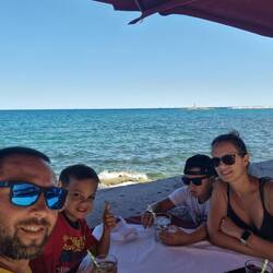 A kényszerpihenő miatt országon belül 1 megálló maradt, Letenyei benzinkút, ami után gondoltunk még egy szlovén hegytetei pihenőre, de Arti pont akkor aludt be, szóval Letenyétől Bašanija 1 huzamban lett letolva. Ez 13:40-es érkezést jelent, ami nem egészen 6 óra 30 perc útidő 2 gyerekkel. Szerintem nem rossz, bár a derekam az kicsit meghalt közben, és ha nincs a tempomat tuti nem bírja a végig.