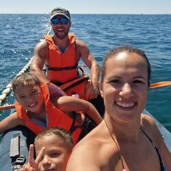 Fél 3-kor végül elindult az utolsó családjárat. Középső ülés helyére a kenuban betettünk két, mentőmellénnyel szumóbírkózóvá alakított gyereket, elől Zsuzsi, én pedig hátul 1 evezővel nekivágtunk a tengernek. Végre nem felejtettem el bekapcsolni az órámon az evezéses edzést, szóval még azt is tudni fogjuk mennyit és merre jártunk. Bár elég nagy hullámok voltak, de ahogy Aragorn is megmondta EZ nem AZ a nap amikor feladhatjuk... Első szakasz a bólyákig tart, ott kis ideig ringattattuk magunkat a hullámokkal, majd megkerültük az első szirtet, és beeveztem a kis kikötőbe ahol valamelyik nap pecáztunk. Először Brúnó ugrott ki a kenuból hogy megmártózzon, aztán a parthoz közelebb Arti is követte, míg mi kieveztünk a parthoz egy korláthoz és odakötöztük a kenut míg ők visszatértek.