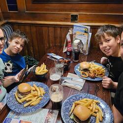 Hazafelé megálltunk a reggelire szánt PUB, a The Beaten Ducket előtt, és úgy döntöttünk, ha már nem sikerült reggelizni, akkor vacsorázni itt akarunk. Igazi angol pub hangulat, vasárnap este fél 6-kor tömve emberekkel minden korosztályból, mindenki sörözik vagy eszeget, ez lesz a mi helyünk. 3 adag hamburger, csípős csirkeszárnyak, sültkrumpli, sör, mi kell még? .... Még egy sör de azt már majd otthon mert mindenki hulla fáradt.