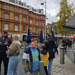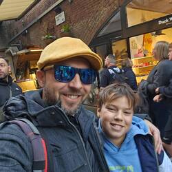 A túloldalon belevetettük magunkat a parti sétány rengetegébe, majd célba vettük a Borough Marketet ami egy hangulatos piac. Útközben végre találtunk egy embert a London Bridge állomáson, aki aktiválta Brúnó Oyster kártyájára a gyerek kedvezményt, és még egy könyvesboltba is betévedtünk ahol Brúnó meglátta az "Egy Ropi naplója" könyvsorozat legújabb részét, és bár angolul van, szerette volna megkapni. Hátha nem olvassa el ezt is 2 óra alatt mint a többit, mégiscsak angolul van, szóval megvettük neki, ráadásul féláron.