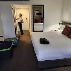 Tuesday – Wal was out of bed at 07:00 to take the clock bits, from Bernie, to Wayne at Russell offices and then took the car to Braddon service station for a wash, where halfway through the wash cycle the machine broke and he had to back the car out. Not a good feeling being stuck in a hot car surrounded by a machine. Very claustrophobic. Back in the apartment we shared a coffee and ate all leftover food for breakfast. At 10:00 Sarah Weir (daughter of Colleen and Peter) arrived to collect the apartment keys and take us to Canberra station, in Kingston, for the 11:45 train to Sydney. A slow trip on this rail line which is a left over from a bygone era. At Sydney Central after asking for directions for the airport train it was an easy transition to our hotel the "Novotel International Airport". An interesting comparison, the airport train cost $25.88pp and the Inter City Express (ICE) train from Frankfurt to Leipzig a four-hour journey cost €4.80pp (AU$8.00). Before dinner we enjoyed a cocktail at the bar to celebrate our long-awaited departure before having a lovely meal and going to bed early.Read more