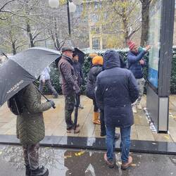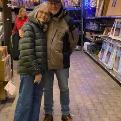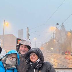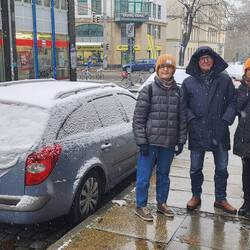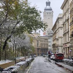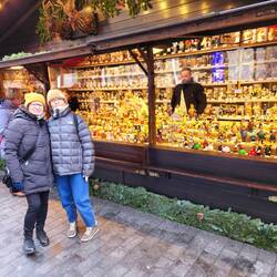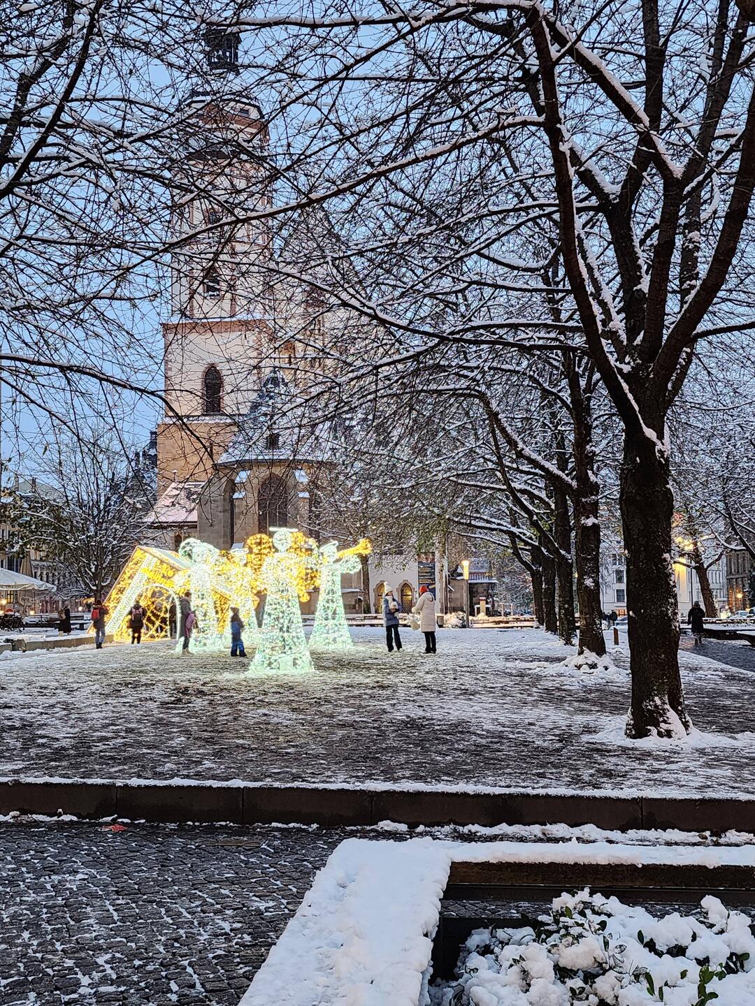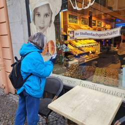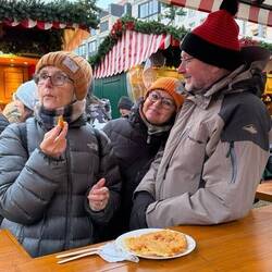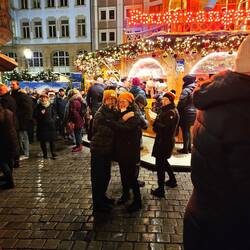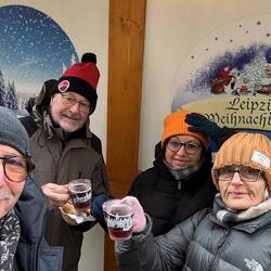 Tuesday – Up a little earlier this morning for our guided tour through Leipzig. The English-speaking guide, Sam came from Bendigo and Melbourne in Australia. A delightful young character, true Aussie, with Leipzig heritage. (Brigitte and Andrea were to see Sam again in Melbourne, where he was leading a guided tour in German, in January 24, three months later) His tour of Leipzig took us from the Gewandhaus in Augustusplatz to the university with the rebuild church front, the St Thomas Church, the city center, the old townhall, the stock exchange, the Nikolas church and finished with the Christmas markets. During the tour light snow continued to fall. As soon as the tour was finished, we walked back to the markets for a fish roll “broodje” for lunch. Lovely, cold, and all the produce covered in snow. After lunch we all went to look for new boots which were warmer and didn't leak and bought shoes for Sylvie and me. We enjoyed the evening city atmosphere and walked home in light snowfalls. How I miss this atmosphere in Australia!! Dinner at home, a couple of drinks and early night to bed at 22:00.