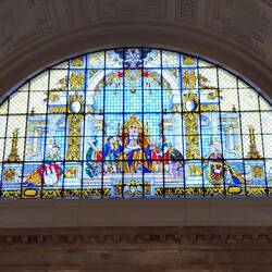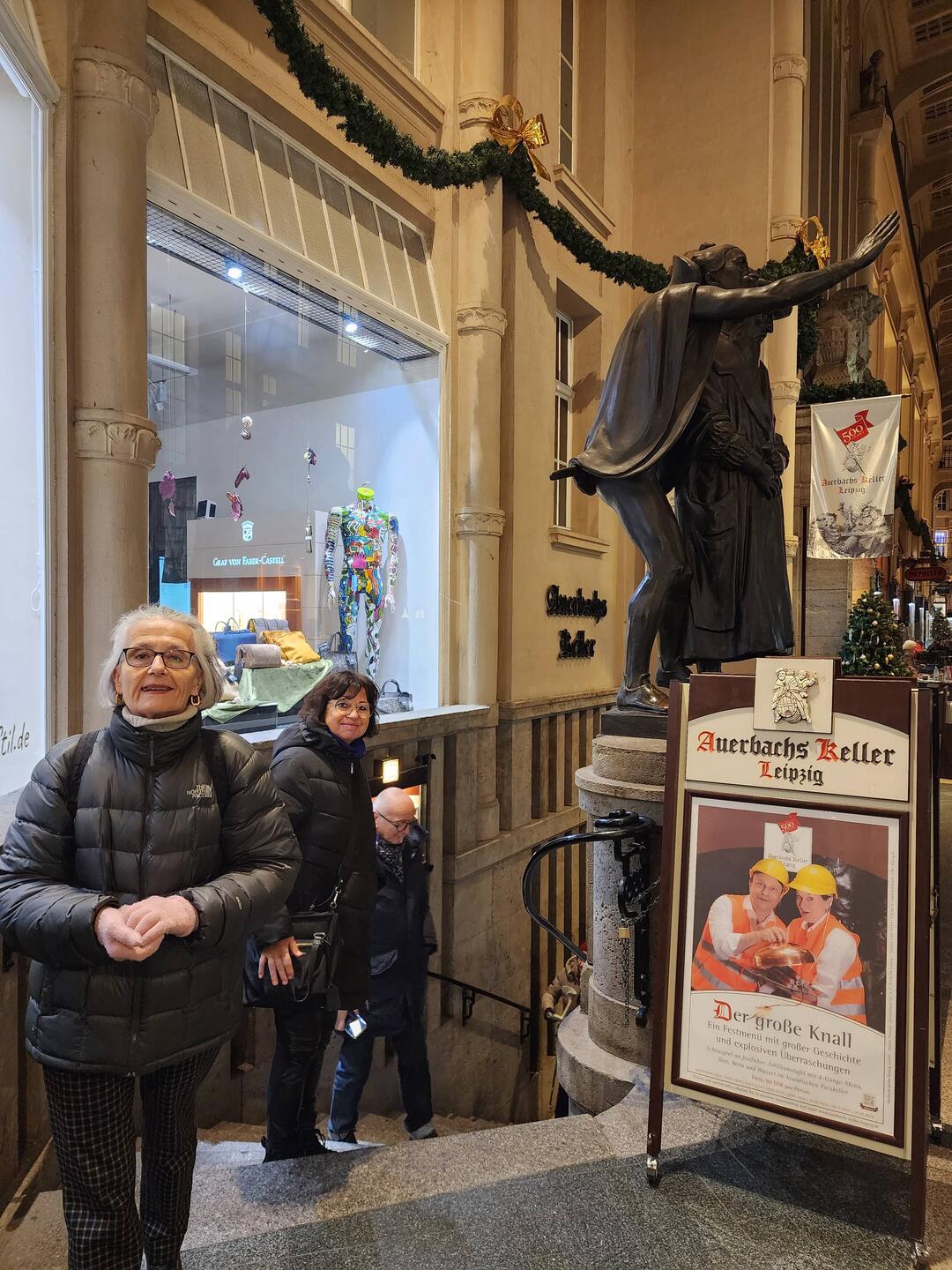 A wine bar at the site was mentioned in historical records dated 1438. The present-day restaurant is located below the Mädlerpassage, a historic covered passage built from 1912 to 1914 at Grimmaische Strasse 2 in Leipzig's historical district. The restaurant has five historical dining rooms: the Fasskeller (Barrel Cellar), Lutherzimmer (Luther Room), Goethezimmer (Goethe Room), Alt-Leipzig (Old Leipzig), and, since 1913, the Großer Keller (Large Cellar). There is also the Mephisto Bar on the floor above available for drinks. The Mädlerpassage replaced the former Auerbachs Hof, a trade fair building complex, erected about 1530 at the behest of Heinrich Stromer (1482–1542), city councillor, professor of medicine, and rector of Leipzig University. Stromer was familiarly called Doctor Auerbach after his birthplace, the town of Auerbach in the Bavarian Upper Palatinate region. When he re-opened the already existing wine vault in the basement rooms, the bar quickly adopted his name. Young Goethe often visited Auerbach's Cellar while studying at Leipzig University from 1765 to 1768 and called it his favourite wine bar. He saw there two paintings on wood dating from 1625, one depicting the legendary magician and astrologer Johann Georg Faust drinking with students and the other showing him riding out the door astride a wine barrel. Goethe was already familiar with the Faust legend from his youth. Between 1912 and 1913 much of Auerbach's Cellar was reconstructed and expanded as part of the demolition of the medieval construction above it and the erection of the Mädlerpassage. It was reopened on 22 February 1913, which is also the date when the two sculptures Mephisto and Faust and Bewitched Students were placed at the entrance.