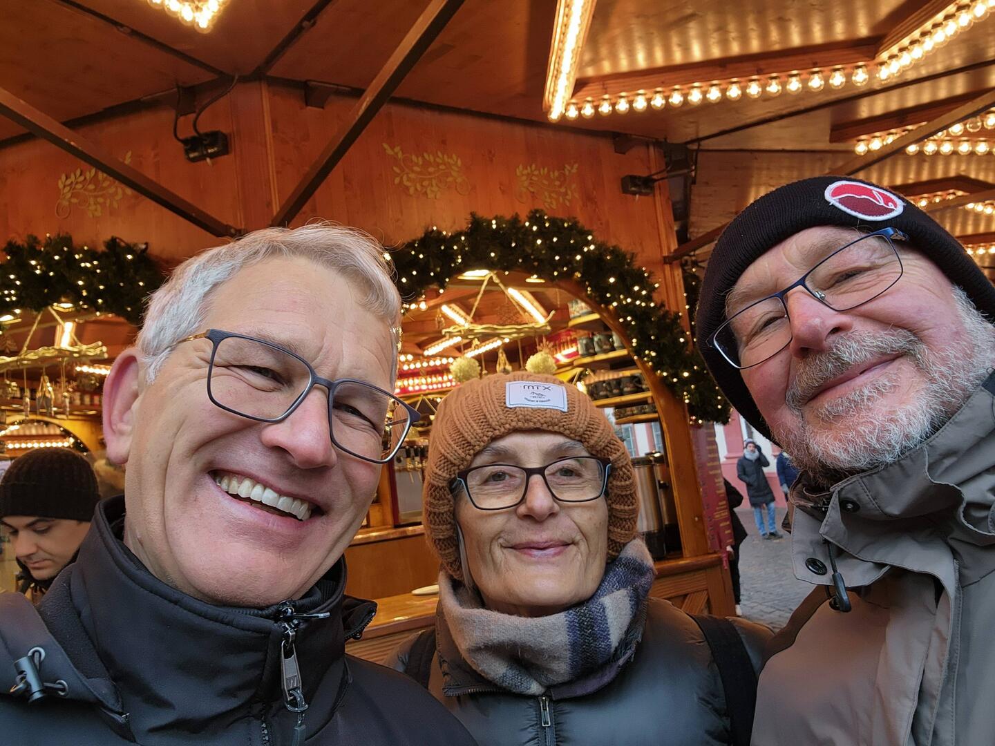 Thursday – Another easy-going day with an unhurried start to the morning. Outside there is still quite a lot of snow and it was cold. Putting on gloves and shoes with chilled fingers and toes presented some difficulties. At midday we walked into town following the “Music Trail”, with Brigitte and Andreas pointing out places of interest. In Leipzig city the Christmas markets are in full swing and before proceeding we first stopped for a sausage and gluhwein (we actually stopped for gluhwein quite often). We also bought a small gift for Liesl and then made our way to a department store to purchase some new underwear and skivvies for me. By now the snow was falling consistently so we wound our way back through the various Christmas stalls, stopping for another herring for Wal, potato cake for Sylvie and gluhwein for all. The evening meal was spelt pasta followed by ice cream for dessert. Bed at 22:00, and the snow continues to fall and cloak the city in a beautiful white mantle.