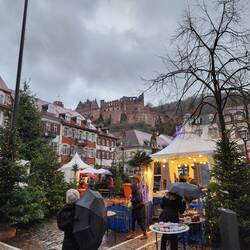 Tuesday – Today it’s Heidelberg. Alarm went off at 07:00 followed by normal coffee and basic breakfast and a shower. Martin has the travel timing down to a tee; we were waiting only a few minutes before the tram arrived and were at the railway station in quick time. The German railway (DB) system is in a mess at the moment but eventually we got a train to Heidelberg. First impressions are that there’s not much left of the old town, after the second war bombings, as we walked along the main pedestrian street. Many similar shops to Australia. We never found the old quarter but located a lovely hotel for lunch. During lunch the weather turned to a sleety rain. After lunch we walked through the Christmas market, had a warming glass of gluhwein and continued to the castle atop of the hill. It’s a long steep slope up but well worth the effort. Inside it has a stark beauty, heavy with history and the story of the huge wine barrel. As dark was falling and the castle closing, we returned to the railway station and caught the train home at 17:30 to enjoy another meal of Martin’s soup and a glass of wine. In bed and asleep by 22:30.