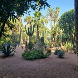 Wir haben Tickets vorgebucht und sind erst ein bisschen skeptisch angesichts der von Google prophezeiten Menschenmassen - aber so voll ist es dann gar nicht. Im Garten ist man unter Riesenbambuswäldern angenehm im Schatten unterwegs, auch sehen wir beeindruckende Palmen, riesige Kakteen und alle möglichen Sukkulenten, dazwischen viele Blumentöpfe in den berühmten Gelb-und Blautönen. Dazu kommt die gleichfarbige, strahlendblaue Villa mit dem knallgelben Fenstern und dem berühmten Springbrunnen. Einen Koikarpfen-Teich gibt es auch und wir entdecken noch kleine Schildkröten und Frösche - ein fantastisch schöner Garten! Ich könnte den ganzen Tag hier verweilen.
