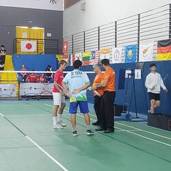 Zeno spielt leider zur gleichen Zeit, wie Marvin. Ich musste mich entscheiden, bei wem ich auf dem Coachingstuhl Platz nehmen soll. Wir entschieden uns für Zeno, um ihn bei seinem Spiel gegen einen für uns unbekannten Thailänder zu unterstützen. Zeno startet sehr gut ins Spiel, hatte dann immer wieder eine Fehlerserie, die den Gegner wieder näher brachten. Er konnte am Schluss den Satz nach Hause bringen (21:19). Nach gutem Sart in den zweiten Satz, häuften sich die Fehler. Der zweite Satz ging an den Thailänder (14:21). Der Entscheidungssatz stand an, wieder erwischte Zeno einen guten Start. Diesmal liess er nicht nach und brachte den Satz relativ sicher in trockene Tücher (21:14).