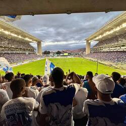 In Belo Horizonte haben wir noch knapp 10 Minuten bis zum Anpfiff. Die Dame an der Kasse versichert uns, dass es keine Tickets mehr hat. Jenny setzt ihr enttäuschendster Gesichtsausdruck auf. Die Frau hat Mitleid und ruft einen Typen herbei. Dieser hat viele Tickets. Sie erklärt ihm auf Portugiesisch, dass wir erst bezahlen, wenn wir sicher sind, dass die Tickets gültig sind. Er begleitet uns zum Eingang. 70 statt 30 Reais möchte er. Jenny märtet ihn auf 60 Reais pro Ticket herunter. Alle Tickets sind echt und wir bezahlen. Zeno kriegt eine Krise, da wir das Doppelte bezahlt haben. Wir erklären ihm, dass das auf dem Schwarzmarkt so läuft. Wir sind direkt in der Fankurve der Cruzeiros. Das Spiel hat bereits begonnen und die Fans sind schon in voller Fahrt. Es ist laut, es wird geschrien, gesungen und getanzt. Es läuft fast mehr als in der Disco gestern. Zeno ist es etwas zu laut, obwohl er die Hörgeräte ausgeschaltet hat. Marvin, Danny und Jenny sind vorne dabei und rufen lauthals mit, obwohl sie keine Ahnung haben, was gesungen wird.