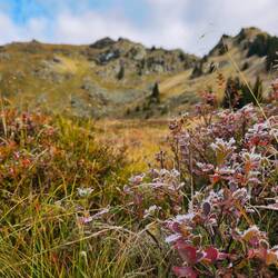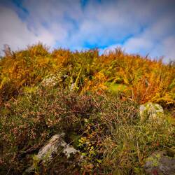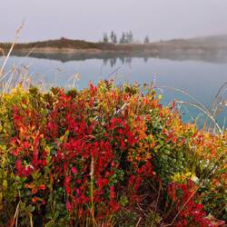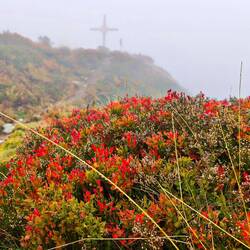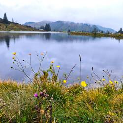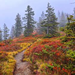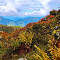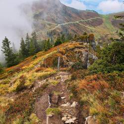 Denn ich entschied mich für den Ausgangspunkt Talkaser 1770m oberhalb von Westendorf mit mehreren Möglichkeiten und dem schön gelegenen Kreuzjöchlsee samt schönen Wegen. Und da oben war Nebensuppe pur. Sicht vielleicht zehn, zwanzig Meter. Der Vorteil: keine Menschenseele unterwegs. Mein Gedanke: Ich nehm gleich mal den Fleiding mit 1892m mit, weil vielleicht bin ich ja da über den Wolken drüber und kann dann sehen, ob sich das Brechhorn 2032m rentiert. Also in gut 25 Minuten statt 45 gemütlich durch den Neben nach oben getastet – und fast das Gipfelkreuz nicht gesehen. Keine Aussicht, dafür schon ein erster Eindruck von den Herbsttönen bei Farnen und ähnlichem Bewuchs. Damit war klar, dass es auch der Gampenkogel 1957m tut. Also wieder runter auf rund 1700m und dann hoch zu Gipfel Nummer zwei. Und hier berauscht mich der Weg durch die Schwarzbeerbüsche mit diesen einmaligen rot-gelblichen Farbspielen! Ich könnte einfach nur Schauen und Staunen und jeden Meter fotografieren, die die Details, die sich darin noch verstecken. Und oben am Gipfel reißt es doch tatsächlich langsam auf – den Fleiding kann ich immerhin schon sehen.