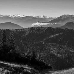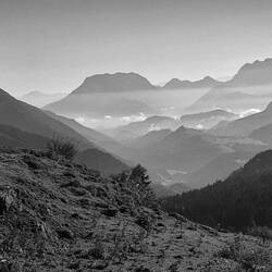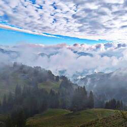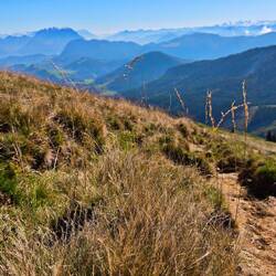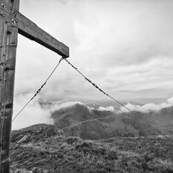 Mit der Länge der Tour nehmen die blöden Gedanken ab, ich marschiere wieder runter auf 1700m und dann weiter um Kreuzjöchlsee 1686m samt Kapelle. Auch hier kein wirkliches Panorama, aber es wird heller und die Sicht geht immer weiter. Zurück geht es zum Talkaser auf einem Forstweg – da das nicht mega spannend ist (auch wenn der am Ende ganz schön steil wird), gönn ich mir noch den Himmelssteig zum Guggenkögele 1886m. Und dann düse ich rüber zum Koasa, der verhüllt sich mal wieder.Baca lagi