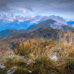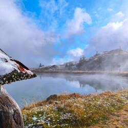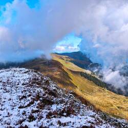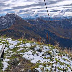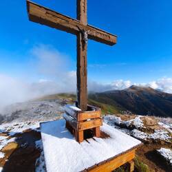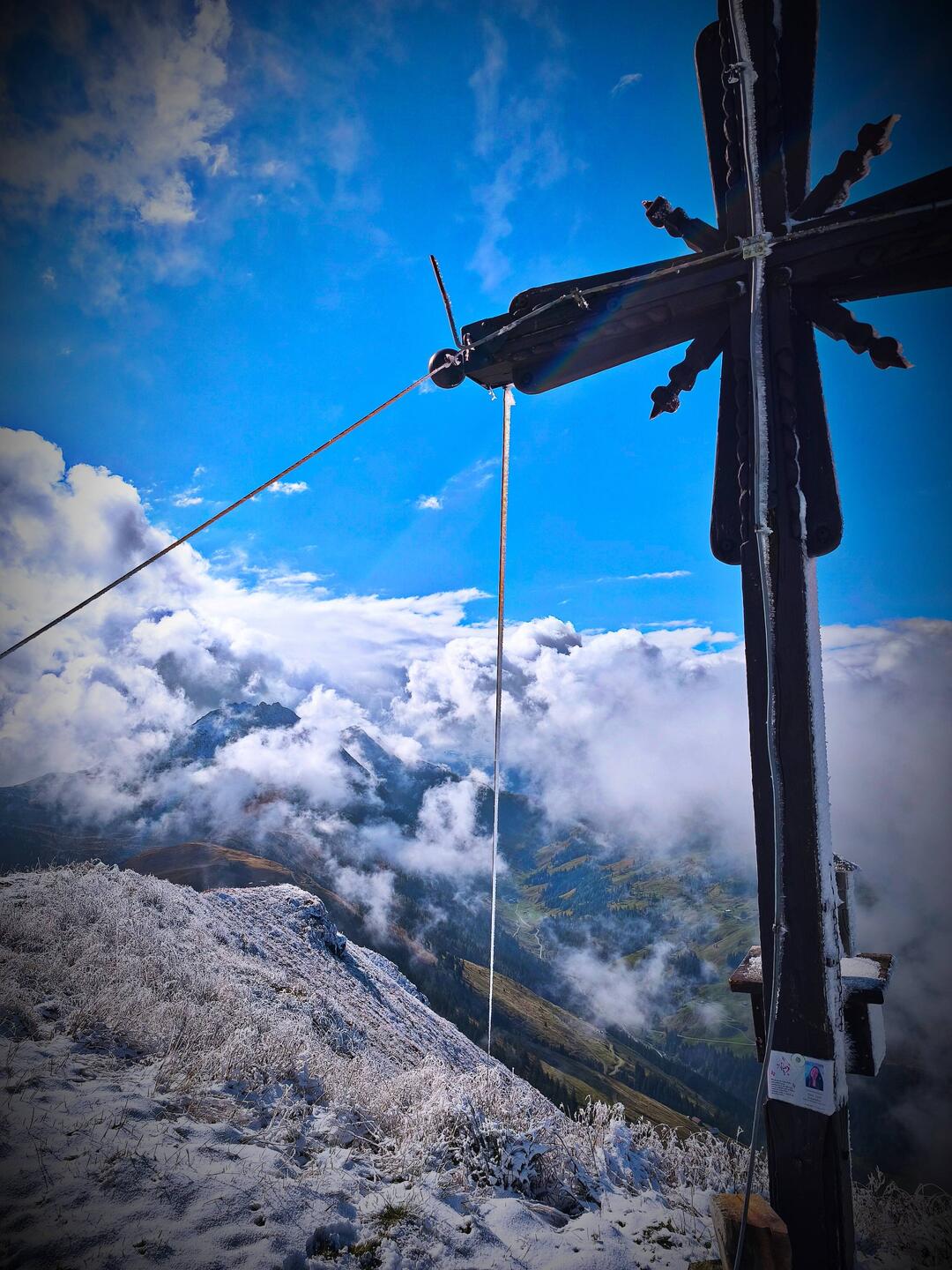 Als ich am Morgen aufwache, begrüßt mich der Kaiser mit Wolkenspiel vor blauem Himmel und einigen sichtbaren Schneespritzern. Nachdem ich aufgrund des ganzen Regens des gestrigen Tags keinen Bock auf Wandern im Matsch habe und erstmal die tatsächliche Schneelage erkunden muss, entschließe ich mich für den Hahnenkamm und überwiegend breite Forstwege. Also rein in die Bahn und rauf – direkt in die Wolken rein. Diesmal ist mein Optimismus ungetrübt – es wird aufreißen! Frisch ist es und schon nach wenigen Metern sind Schneeflocken auf den Farnen, Tannen und Büschen zu sehen – und drei englischsprechende Mädels in Höschen, die knapp über dem Arsch enden! Immerhin haben sie oben eine dicke Jacke an … Aber wie noch öfter an dem Tag gibt es zu viele Menschen, die keine Ahnung von Berg, Wetter und Jahreszeit haben – geht ja ne Bahn nach oben… Da sehe ich parfümierte Damen im Sonntagsspazierlook, Männer in weiß-goldenen Glitzerturnschuhen. Aber erst einmal bin ich wunderbar allein! Zumindest fast: Da oben ist Baustelle für einen neuen Speicher für Schneekanonen und ein Verkehr wie auf der Autobahn. Alles ist in Wintervorbereitung, die erste Kanone wird gerade getestet. Schon krass, was wir der Natur antun… Ich genieße die verschiedenen Stimmungen, die Wolken, Wind und Neben zaubern, die Aus- und Durchblicke, bevor alles wieder grau wird. Eindrücklich ist es, als Nebenschwaden über den Brunnsee 1879m wabern und sich plötzlich ein Wolkenfenster für die Sonne öffnet. Jetzt schnell zum Pengelstein 1938m. Die Sonne strahlt auf ihn herab, doch noch hält sich das Panorama zurück. Ich marschiere weiter, denn Hauptziel ist der Schwarzkogel 2030m. Noch 1,5 Stunden sagt mir eine Wandertafel. Kurz hinter dem Usterkarsee 1919m hört der Fahrweg auf, der Wanderpfad über eine schöne Almwiese startet – total nass. Mein Ziel samt Aufstiegsweg den Bergrücken hinauf direkt im Blick. Das soll in 50 Minuten zu schaffen sein? Es geht erstmal runter auf 1829m in eine Scharte, die Landschaft ist weiß gezuckert, der Gipfel in Wolken. Ich nehme den Bergpfad unter die Wanderschuhe und schneller als gedacht hab ich den ersten Buckel genommen. Plötzlich taucht schon das Kreuz auf – und die Sonne kommt durch und wärmt so schön! Ich sehe den Gampenkogel von Montag, den markanten Großen Rettenstein. Die Sonne wirkt auf dem Grashang Richtung Pengelstein durch die Wolken wie ein Scheinwerfer. Feine Eishaare verzieren das Kreuz und dessen Befestigung - welch ein Kunstwerk der Natur! Ich könnte ewig hier bleiben! Doch leider geht das nicht und bevor es wieder zuzieht, steige ich begeistert ab. Und auch die Gedanken an die Arbeit lassen mich in diesen Tagen nicht so los… Ich bin nicht mutig genug, Neues zu wagen, schießt es mir mehr als einmal durch den Kopf. Dabei würde ich gerne… Am Rückweg ist der Brunnsee nun in Sonne getaucht, es sind nun einige Leute unterwegs. Danach mach ich noch einen Abstecher auf den Steinbergkogel 1972m und marschiere dann über den Ehrenbachhöhesee 1765m inklusive Schaukelpause zurück zum Hahnenkamm und der Bahn. Es war eine wunderbare Runde von 9 bis halb zwei mit rund 700hm und einmaligen Ausblicken nur für mich.Baca lagi