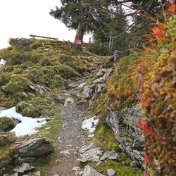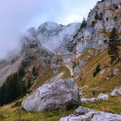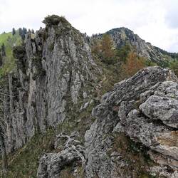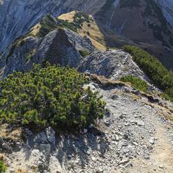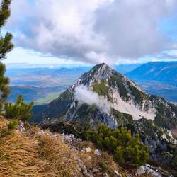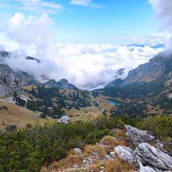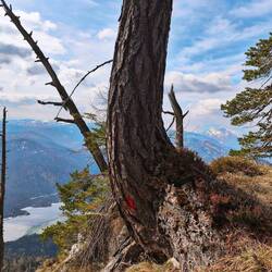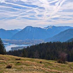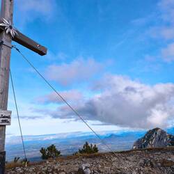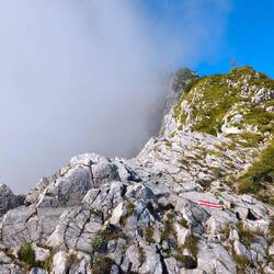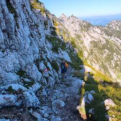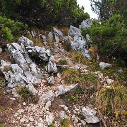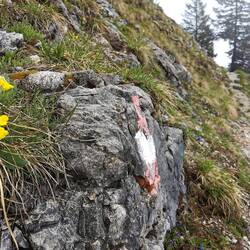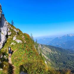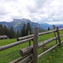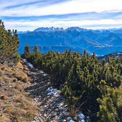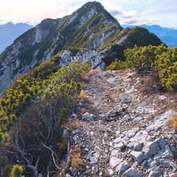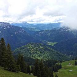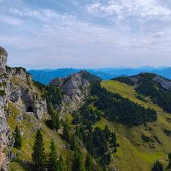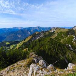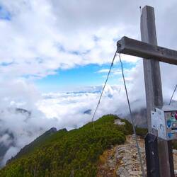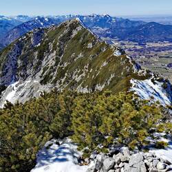 Wenn ich schon so weit fahre, dann muss eine Tour sein - Hans und ich hatten noch eine Rechnung mit der Zwiesel-Gamsknogel-Überschreitung offen. Flugs stürmen wir in 2 Stunden die 900 hm zum Zwiesel (1781m) und neben dabei noch kurz darunter schnell den Zennokopf mit. Bis hierher ist alles bekannt, die Aussicht super, denn die Wolken, die mir am Morgen bei der Herfahrt ein Schauspiel geboten haben - über den Alpen schon weg, überm Chiemsee dunkle Massen -, verziehen sich immer weiter. Nun wird es richtig genial - wir nehmen den Grat rüber zum Gamsknogel (1750m). Was für ein genialer Pfad mit Seilstellen, Kraxelpassagen, zwischen Latschen, ein leichtes auf und ab. Mega! Und das Gipfelkreuz ebenfalls voll schön und für uns allein. Steil und felsig geht es hinab auf die wunderschöne kleine Hochfläche der Kohleralm, bevor uns der Wald verschlingt und wir unsere Rundtour wieder beenden.