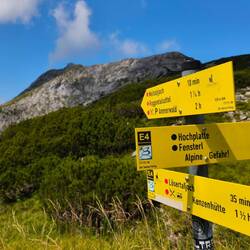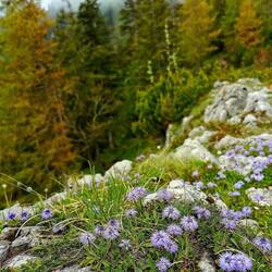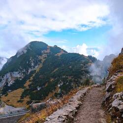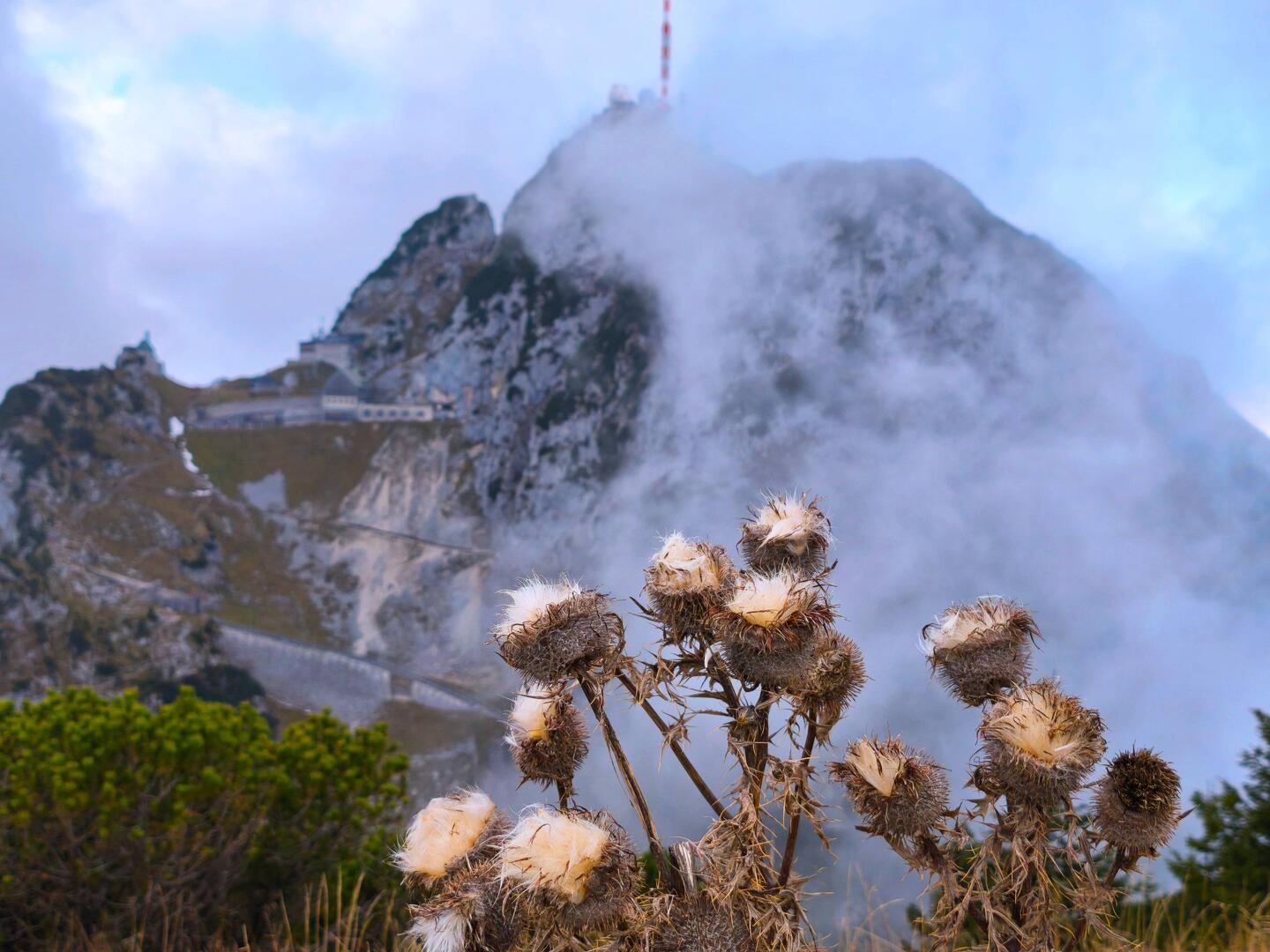 Unsere Tour zum Hohen Göll startete auf der Rossfeldstraße am Ahornkaser hoch zum Purtschellerhaus. Am Hinweg nahmen wir den direkten Weg – über unzählige leicht rutschige Holzstufen nach oben. Meine beiden älteren Herren, die erst noch meinten, sie würden ja so schnaufen, und ich hatten rasch ein mit uns gestartetes Pärchen überholt. Von wegen Schnaufen – die beiden sind mir am Weg immer mal wieder enteilt – weil ich vorsichtiger war, weil ich aktiv auf mein Herz geachtet habe (das hat aber null gemotzt!) und weil ich natürlich fotografieren musste. Meine Muskeln haben die etwas über 1200hm besser verkraftet als gedacht.