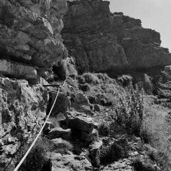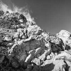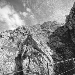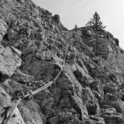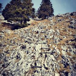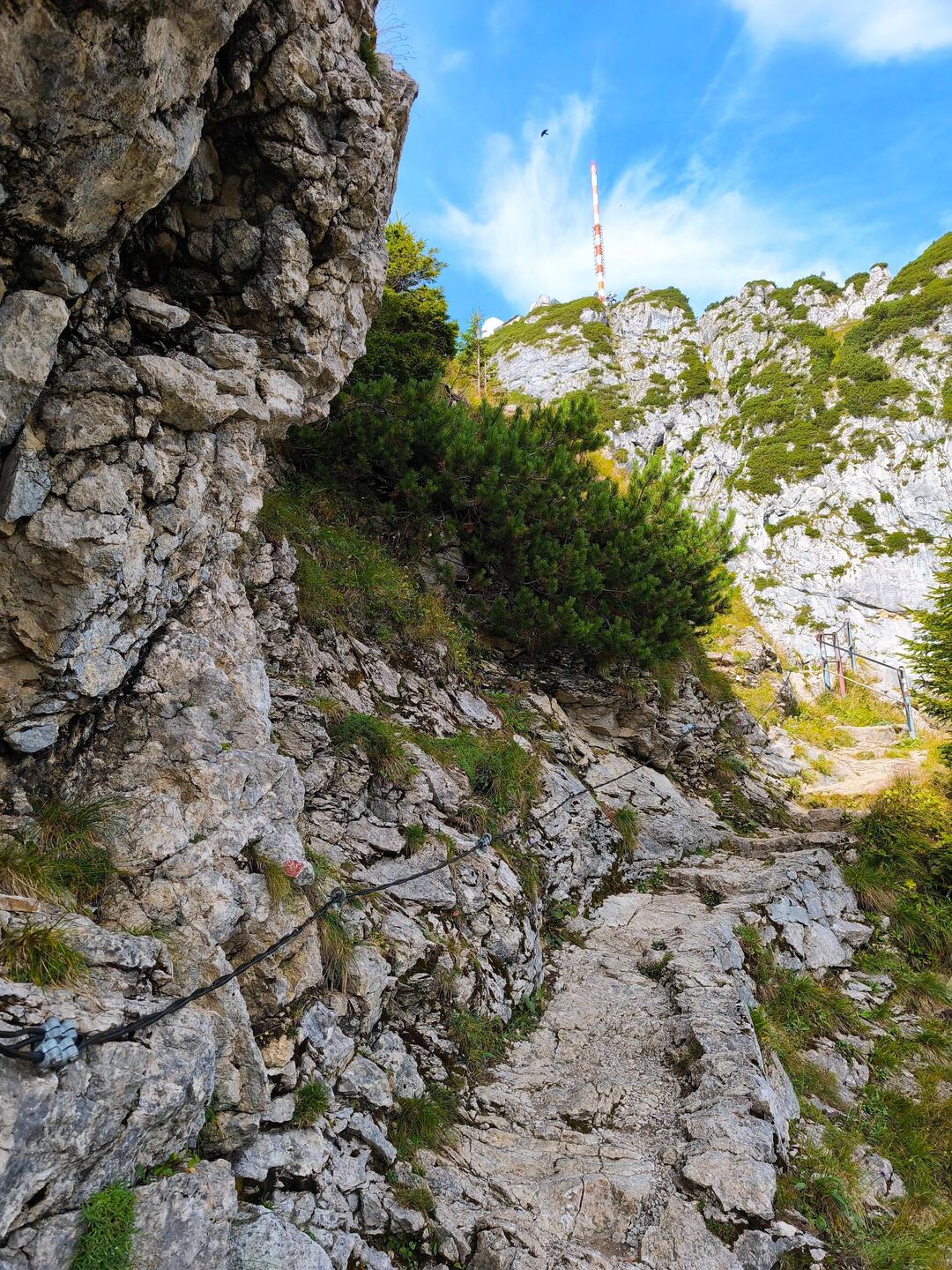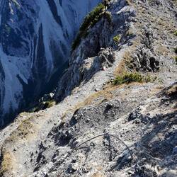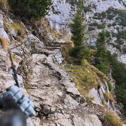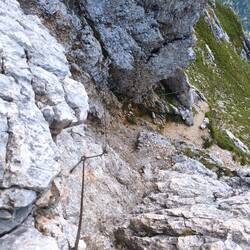 Rasch waren wir am Purtschellerhaus; von dort ging ein Wiesenpfad hinauf – nach Regen der letzten Tage und Kälte in der Nacht noch rutschig. Na bravo. Ich tröste mich damit, dass das bis zur Rückkehr sicher trocken ist. Dann beginnt der Einstieg in den Salzburger Steig, den ich jetzt mit Helm in Angriff nehme. Der Pfad – eine Mischung aus Gehgelände und kleinen bis größerem Kraxelstellen – auch mal mit Stahlseil – windet sich rechts am Göll-Massiv nach oben. Immer wieder gibt es kleine Kreuze, die an Verunglückte erinnern oder markante Übergänge markieren. Manchen Stellen sind ohne Sonne noch wahnsinnig rutschig. Später kommen dann auch ein paar Schotter-/Geröllstellen hinzu. Immer wieder denke ich mir: Hier komm ich nie wieder runter! Doch erfahrungsgemäß ändert sich beim Hinabgehen die Perspektive und ich hatte zu keiner Zeit Angst, nur Respekt.