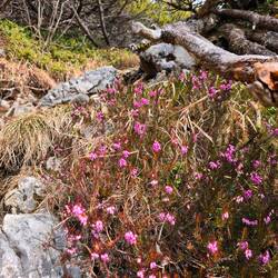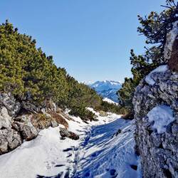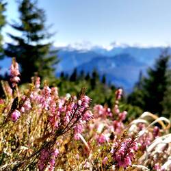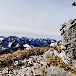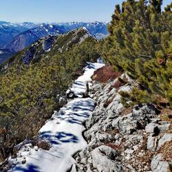 Nachdem ich mit meinem liebevoll betitelten Wander-Senior Hans schon seit Monaten nicht mehr zusammen unterwegs war und ich nach meiner Februar-Tour allein wieder Selbstvertrauen getankt hatte, dass ich wieder fitter bin und mit dem raschen Hans mithalten kann, und außerdem die Wettervorhersage bestens war, fragte ich ihn einfach mal zwecks gemeinsamer Wanderung an. Er hatte nämlich eine ziemlich coole Runde im Auge, die auch auf meiner Liste stand - die Gratüberschreitung zwischen Zwiesel und Gamsknogel in den Chiemgauer Alpen. Je nach Schneelage könnte es eine echte Herausforderung für mich werden, aber auf die hatte ich richtig Bock - ohne Angst. Los ging es früh morgens bei strahlendem Sonnenschein - ich musste mich zeitig von Jacke und dann auch Langarmshirt befreien, sonst wäre ich zerflossen; die Füße in den dicken Winterwandersocken kochten am Ende des Tages - trotz einiges Schneegestapfes. Hans hatte noch eine Überraschung parat: Sein Namensvetter war auch dabei - wie damals vor ziemlich genau drei Jahren am Geigelstein, als wir uns kennenlernten! So nahmen wir Etappe eins bis zur Zwieselalm in Angriff - über Forstweg und abwechslungsreichem Mulisteig über Steine und Wurzeln. Ein Pfad nach meinem Geschmack, der sich so bis zu den Gipfeln zog. Irgendwann öffnete sich der Blick von Watzmann bis Wilder Kaiser - was für ein Vorgeschmack auf das Panorama, das uns oben erwartete! Ich wollte unbedingt ein Bild mit rosa Erika vor schneebedeckten Bergen (welche schönen Farben da zusammenkamen!) und verrenkte mich bei einigen Pflanzenansammlungen - teilweise gemeinsam mit meinem Hans, während der andere Hans langsam weiterstiefelte. Als wir ihn wieder einholen mussten, stapfte ich beherzt hinterher und mein Hans meinte dann, ich hätte da ein rasches Tempo angeschlagen, da wäre er kaum hinterhergekommen. Wie gut diese Worte taten nach den letzten Monaten! Weiter oben - wir hatten eine kurze Trinkpause an der Alm gemacht und der Pfad schlängelte sich über Wurzeln, Steine, durch Latschen und über zwei, drei Leitern mit Blick auf den auf den ersten Blick schneelosen Grat zwischen Zwiesel und Gamsknogel hinauf - kamen wir nun in ein größeres Schneefeld, das etliche eisige Stellen hatte und da war Hans' Motor richtig warm gelaufen (ich hatte nichts anderes erwartet, war aber trotz Geschnaufe mit mir zufrieden) und ich kämpfte mich ein, zwei Meter hinter ihm durch die weiße Masse hinauf zum Zenokopf. Ein kleiner Zwischengipfel mit Wahnsinns-Blick auf den Hochstaufen samt Gratverlauf ganz für uns! Nur wenige Minuten später waren wir dann oben und genossen Sonne, eine wunderbare Aussicht und einige Gleitschirmflieger am Himmel. Eine andere Wandererin, die Hans und mich lustigerweise bereits vergangenes Jahr am Hochgern fotografiert hatte und dies wieder tat, war beim Versuch, den Grat zu machen, nur ein paar Meter weit gekommen. Denn in den Latschen und Felsspalten hatte sich noch eine Menge Schnee versteckt. Der Weg sah aber dennoch ziemlich gut aus, reizte mich sehr - wie auch Hans. Also war klar: Wir versuchen es und schauen, wie weit wir kommen. Auf mehr oder weniger schmalem Weglein am Grat - wie geil muss das ohne Schnee sein! - gingen wir bis zu einer seilversicherten, eingescheiten Senkrechten. Man sah nicht, wo man hintrat. Die Spuren waren da schon längst zu Ende, wir waren Pioniere bis dahin! Nachdem Hans wusste, dass kurz vor dem Gamsknogel die Seile unter Altschnee liegen und eine weitere Stelle wie die, an der wir standen, folgte, drehten wir um. Es passiert einfach zu schnell etwas. Aber eines ist klar: Ohne Schnee greifen wir das an und es wird sicher mega! Nachdem der andere Hans vom Zwiesel währenddessen zur Alm zurückgegangen war, machten auch wir uns an den Abstieg - nicht ohne den ein oder anderen Fotostopp mit Details und spannenden Durch- und Aussichten. Nach unserer absolut gelungenen Tour kehrten wir im Tal noch ein - der perfekte Abschluss eines tollen Tages!
