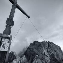 Dann sind wir am Abzweig Kamin – Schusterroute. Wir gehen den Kamin hoch – wieder Name sagt, eine kaminartige Kletterpartie am Stahlseil. Sehr geil! Am Ausstieg angekommen, pfeift der kühle Wind wahnsinnig. Und der Weg am Göllleiten zieht sich…Schrofengelände, wieder etwas Kraxelei – und endlich ist es da, das wunderschöne Gipfelkreuz mit Bergkristall. Und die Wolken hat der Wind weggeblasen. Was für ein Schauspiel, was für eine Aussicht! Wären da nicht zig andere Bergsteiger gewesen, ich hätte gejubelt, dass ich es geschafft habe; zumindest Teil 1. Wie genießen im Wind eine kurze Brotzeit mit Fotoshooting am Kreuz und Gipfelschnaps, bevor es an den Abstieg geht. Die Schusterroute soll einfacher sein. Naja, die Kraxelei am Seil ist deutlich länger, die Tritte schwieriger. Es ist höchste Konzentration gefragt – wie am gesamten Weg ab Purtschellerhaus. Das Gute – Gedankenspiele haben keine Chance. Irgendwie doch schnell sind wir wieder am Abzweig und dafür, dass ich dachte, ich komm nie wieder runter, geht es gut und immer weiter abwärts. Aber auch der Abstieg ist viel Kletterei. Da ist das Lob von meinem Hans besonders schön: Ich hätte gute Griffe am Fels! Dabei hab ich nie wirklich geklettert…. Und dann sind wir wieder am Purtschellerhaus samt kleiner Einkehr und über einen nun angenehmeren Pfad wieder am Auto. Yeah! Das war wohl eine der schwersten Touren meines Lebens – und ich habe sie gut gemeistert! Reine Gehzeit hatten wir rund 5:15 Stunden. Zur Einordnung: Am Purtschellerhaus stand als Zeit zum Göll 4,5 Stunden …