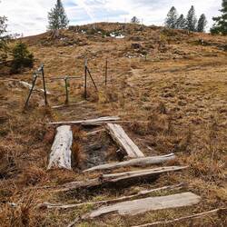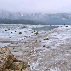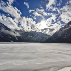 Endlich sollte es so weit sein: Ich durfte einen Teil meines Teams für den Sommer auf der Dawin-Alm kennenlernen! Damit sich die Fahrt auch lohnt, plante ich gleich ein Wochenende in einer Ecke, in der ich eigentlich noch nie war. Das Wetter war mies bis mäßig gemeldet - keine Sicht, Regen, Schnee. Also mal sehen, was geht. Nachdem ich am Anfahrtstag ja nicht so viel Zeit hatte und intelligenterweise auch noch den Faschingsferien-Anfang erwischt hatte, nahm ich mir nur was Kleines vor; in Stress sollte der Tag nicht ausarten. Die Idee - mal zum Eibsee zu wandern. Da würde sicher nicht so viel los sein, 265 Höhenmeter sollten es auch sein und ich könnte auch mal die ungefähre Schneelage für tagsdrauf checken. Um dreiviertel neun marschierte ich in Grainau - passenderweise bei der Bergwacht - los. Alles Grau in Grau, aber noch trocken. Später sollte es regnen und sogar einige Flocken tanzten gegen Mittag durch die Luft. Vorbei am Badersee mit seinem Inselchen - den ich sogar mit Grödeln umrundete, weil der Pfad eine reine Eislaufbahn war - wanderte ich durch superschönen Zauberwald mit alten Bäumen und Steinbrocken hoch zum Eibsee. Menschen netterweise auf dem Weg Mangelware. Nach 4,3 Kilometern und 60 Minuten statt 1,5 Stunden änderte sich das - ich war am Eibsee angekommen. Und irgendwie hat er mich gar nicht so geflasht... Vielleicht weil die Farbe wegen der Eisschicht nicht so durch kam, vielleicht weil die Bergwände außen rum fehlten wegen der tiefhängenden Wolken... Nachdem ich noch Zeit hatte und die Luft so schön klar war, bin ich noch eine halbe Stunde am See entlang spaziert, den dieser tolle Wald einfasst. Immer wieder gab es schöne Durchblicke. Dann ging's ans Umdrehen, damit ich mittags wieder in Grainau bin, um rechtzeitig nach Strengen in der Arlberg-Region losfahren zu können. Nächstes Highlight: die Fernpaß-Route. Landschaftlich selbst bei schlechtem Wetter beeindrucken - steile, enge Hänge, tief untenliegende See. Und ebenso fast wie eine Schlucht wirkt das Tal von Strengen. Das Dorf zieht sich am Hang hoch - leider versteckt in den Wolken. Nervös war ich eigentlich nicht, nur ob ich Christine und Edi erkennen würde oder sie mich. Aber im Dorfgasthaus kein Problem. Es war gleich so herzlich! Eine Umarmung zur Begrüßung, als würden wir und schon lange kennen. Über zwei Stunden saßen wir zusammen; ich hab etwas über die Arbeit, die Leute, das Dorf erfahren und die beiden kennengelernt. Ich glaube, das wird richtig gut im Sommer!