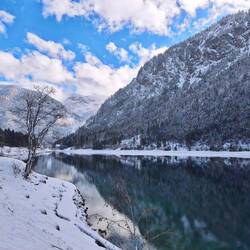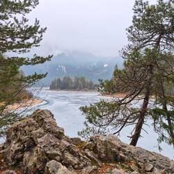 Aber erstmal gab es Schnee. Wie viel es oben geschneit hat über Nacht, konnte ich aufgrund der geringen Sicht kaum einschätzen. Die Idee: das Koflerjoch bei Reutte, denn bis zur Dürrenbergalm gibt es einen Forstweg. Und der war bereits beim Start am idyllischen Urisee, der später bei Sonne und aufgerissenem Himmel ein herrliches Fotomotiv mit Bergen abgab, gut verschneit. Eine Spur war schon zu sehen - perfekt zum Hinterherstapfen, und zwar über Steig statt Forstweg. Den könnte ich ja runtergehen im Notfall (war aber nicht nötig), denn es schneite noch leicht. Im dichteren Wald hatte die weiße Pracht kaum den Boden erreicht. Irgendwann überholte mich eine Frau mit Hund. Ich hatte das Gefühl, ich war heute null in Form, langsam irgendwie. Luft und Herz waren aber kein Problem. Im Endeffekt war ich nach 500hm und einer Stunde (mit zig Verschnauf- und Über-mich-Kopfschüttel-Pausen) an der Alm. Die punktet normalerweise mit bestem Panorama - diesmal ins von hell bis dunkler changierende Grau. Netterweise ging eine Spur (die Frau mit Hund kehrte da offenbar wieder um) weiter über die Almwiese Richtung Koflerjoch. Dachte ich. Doch sie endete ein Stück weiter oben im Wald an einer kleinen Privathütte. Ich marschierte zurück zum Abzweig mit Schild. Versuchte mich an der Wegfindung, ging mal hier, mal da ein Stück, aber hatte halt null Plan, wo ich ungefähr hinmusste. Da riss unten die Wolkendecke auf und gab einen kurzen Blick ins Tal frei. Und ein Mann kam fast schon hochgesprintet. Der Plan war klar: dem Einheimischen in ein paar Minuten folgen ;-) Und ohne diese Spuren wäre meine Tour an dieser Stelle schon beendet gewesen. Also watschelte ich hinterher. Es wurde steiler, teilweise rutschiger und tiefer. Und das Wetter besser - plötzlich blauer Himmel und Sonne über den verschneiten Bäumen. Was hätte ich mich geärgert, das verpasst zu haben. Beim Start ins letzte Drittel der Tour - nach rund 800hm - beschloss ich aber, umzukehren. Mir war es echt zu rutschig und steil und ich kannte ja den Untergrund, der da noch kommen sollte, nicht. Und so muss ich unbedingt wiederkommen, weil im Sommer alles null Problem, sogar mit etwas Felskraxelei am Ende ;-) Vielleicht auch besser so, weil kurz darauf kam der Sprinter von vorhin wieder zurück. Wir kamen ins Gespräch und setzten den Weg inklusive Schnapserln in der Alm bis zum Parkplatz zusammen zurück. Tobi meinte auch, es sei wahnsinnig rutschig gewesen und auch keine Sicht. Schnell hatte es nämlich wieder zugezogen. Aber auch so war es echt schön, weil die Gesellschaft einfach mega nett war! Eigentlich schade, dass wir keine Nummern getauscht haben, der wär schon interessant gewesen... Am Heimweg nahm ich dann noch den Plansee mit - ebenfalls im Sonnenschein. Eine super Abrundung für ein Wochenende, an dem viel mehr ging als gedacht und das wieder schöne Momente parat hatte - auch ohne Gipfel (was mich dennoch ganz minimal ärgert, weil andere sich da nicht solche Gedanken machen und ich es locker geschafft hätte ...)Read more